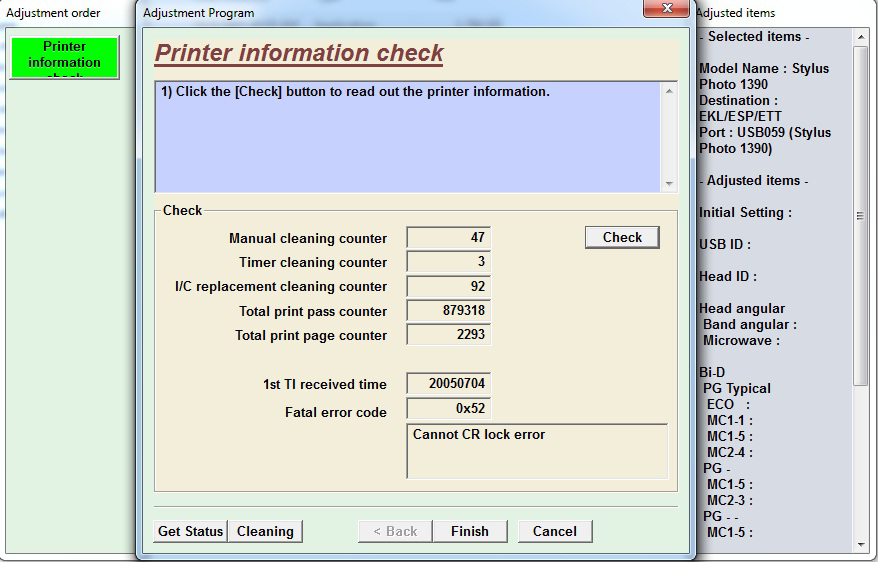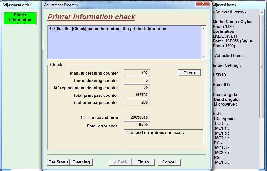 7. Kabel-kabel ada yang terputus akibat tersenggol atau digigit tikus Solusi : cek semua kabel-kabel apakah ada yang terputus atau tidak . Cara pengecekan bagian mana dari printer yang error : 1. Buka folder resetter di DVD Training , Contoh untuk Printer DTG basis Epson 1390 2. Ganti tanggal di Komputer menjadi 04 oktober 2007 dengan program Date Cracker.bat di folder resetter. 3. Jalankan Software Resetter ( Klik kanan Adjprog.exe lalu pilih Properties, pilih compatibility, pilih Run this program in compatibility mode for Windows XP) 4. Jalankan Software Resetter ( Klik kanan, Run as Administrator) 5. Pilih printer 1390 dan port USB yang digunakan 6. Pilih Particular Adjustment Mode 7. Pilih Printer Information Check di bagian paling bawah 8. Pilih Check 9. Pelajari fatal error code yang keluar atau kirimkanscreenshothasil Printer Information Check tersebut ke email hobby_print@yahoo.com atau support@hobby-print.com